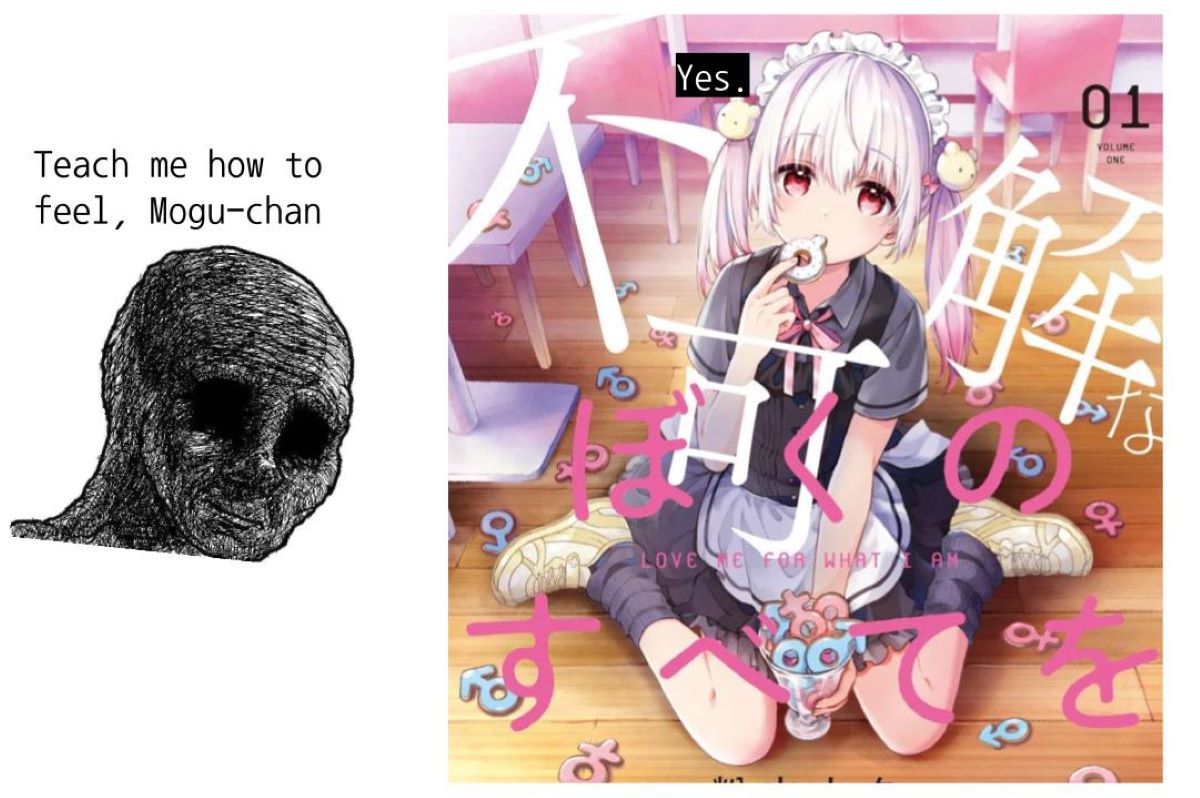 was because I read FukaBoku as a cloistered closet case, burning myself up with the knowledge that I couldn’t be upfront with my family regarding my gender identity (non-binary, and wanting to present myself similarly to Mogu-chan). This, despite the fact that my family would “Love Me For Who I Am,” so I just wound up burning myself on an ouroboros of hatred and frustration. It’s often said that people hate that which they relate to, or see parts of themselves in, the most; this is probably why Neon Genesis Evangelion has such a vocal hate-dom, and it’s certainly why I had such a strong revulsion to Mogu-chan’s character at first. I wanted a cute non-binary main character in a cute slice-of-life series, and they were just… obnoxious, loud, whiny, sensitive to the point of imposing on other people, all in spite of having friends offer themselves as a listening ear. I had none of their support network, at least offline, and none of their unpleasant traits, so what’s wrong with them, that I can be better?